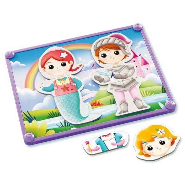 הערכה כוללת לוח מגנטי מעוצב ודמויות מגנטיות, יחד עם מבחר רחב של בגדים ואביזרים בהשראת דמויות מעולם האגדות.