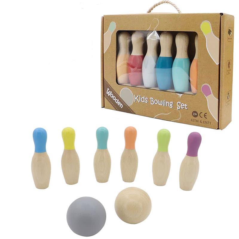 ערכת הבאולינג מעץ כוללת 6 פינים וכדור, כולם עשויים מעץ איכותי ומעוצבים .