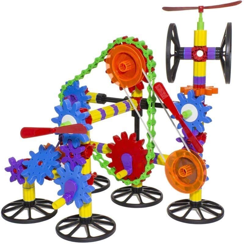 • מערכת גלגלי שיניים צבעונית וגדולה: גלגלי שיניים גדולים וצהובים שניתן להרכיב לכדי מבנים מכניים.