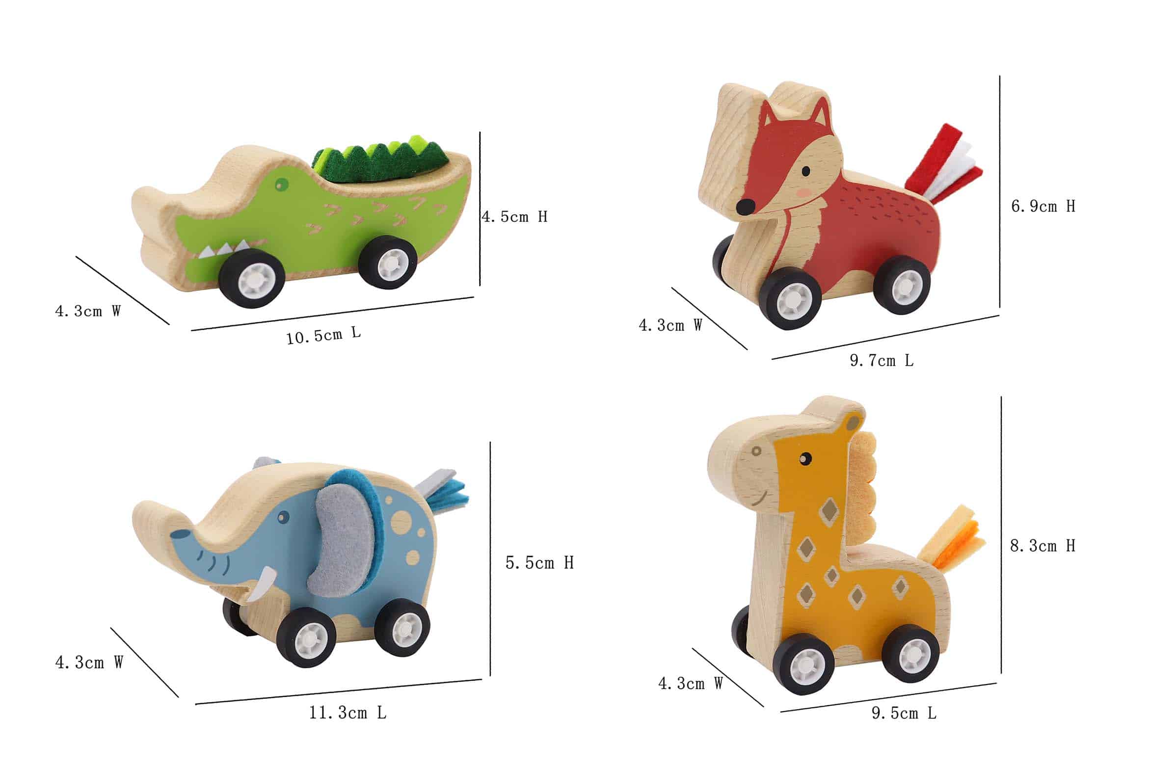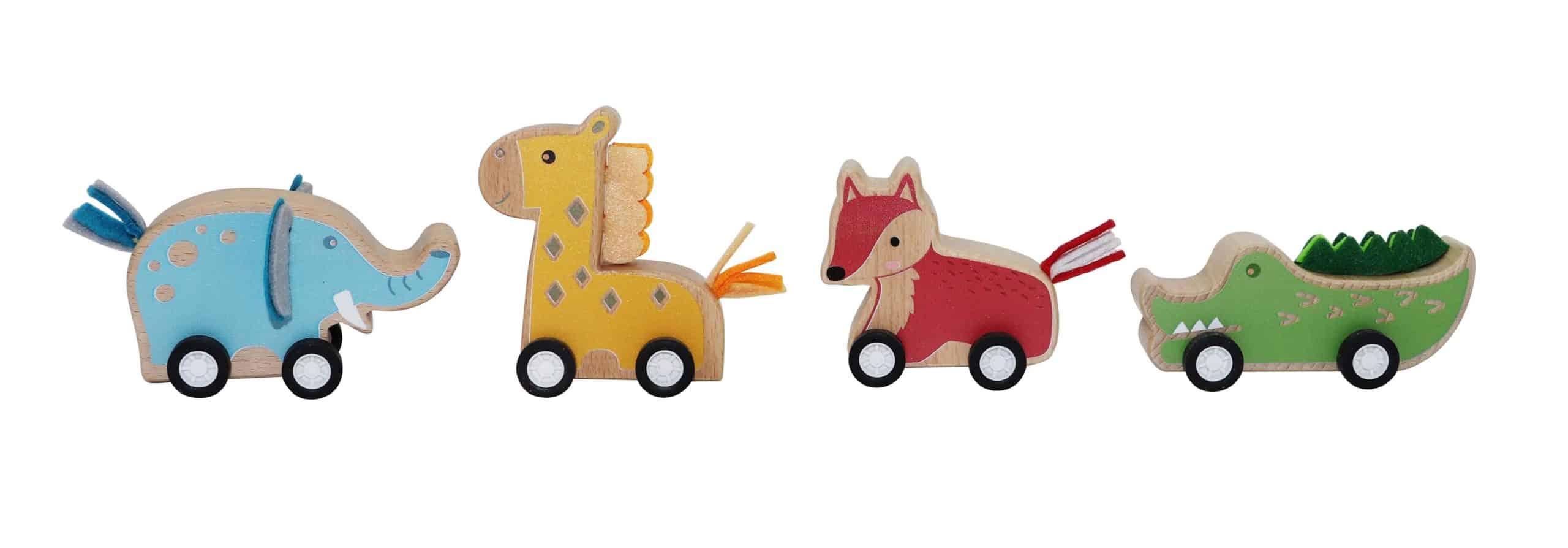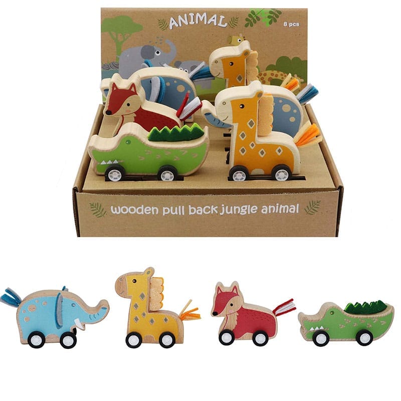 החיות מעוצבות מעץ עם גלגלים, ותנועתן המהירה לאחר משיכה קלה מוסיפה חוויית משחק דינמית ומהנה.