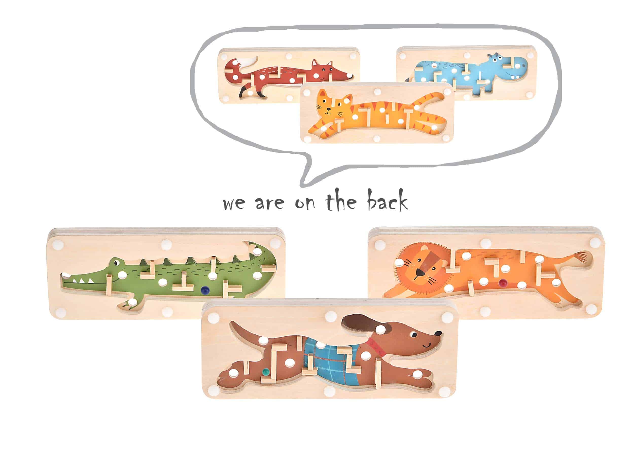 המבוך כולל לוח עץ דו-צדדי עם מסלולים מאתגרים לכדורים קטנים בעיצוב חיות.