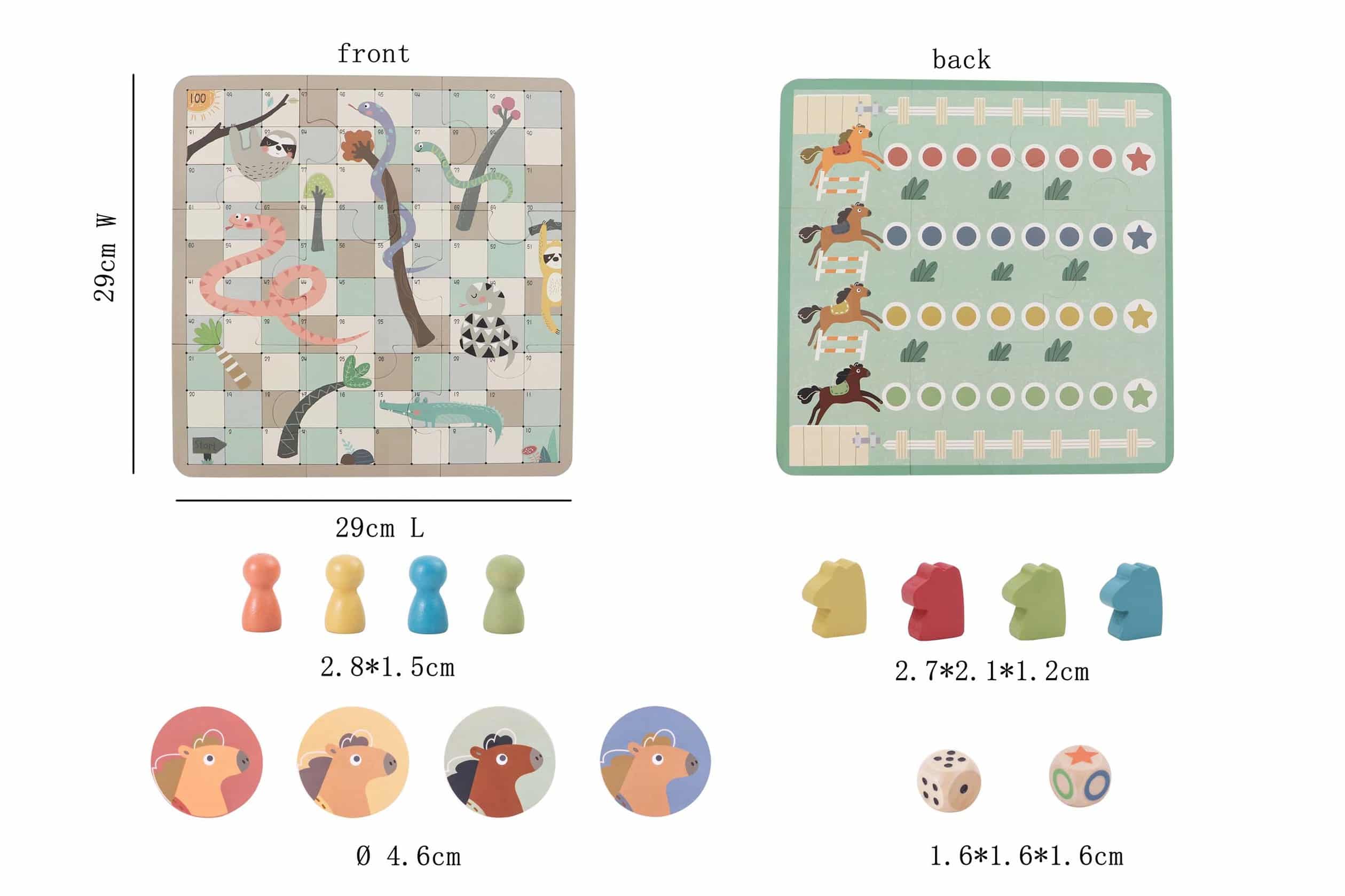 המשחק כולל לוח משחק עם סולמות ונחשים, ובא עם קוביות צבעוניות .