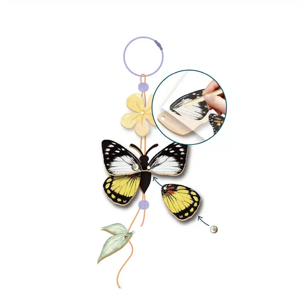 עם כלי העץ המיוחד, יש להניח את מדבקות הצבעוניות על חלקי העץ ולאחר מכן להרכיב את תליית הפרפר באמצעות החוטים והאטמים המצורפים.