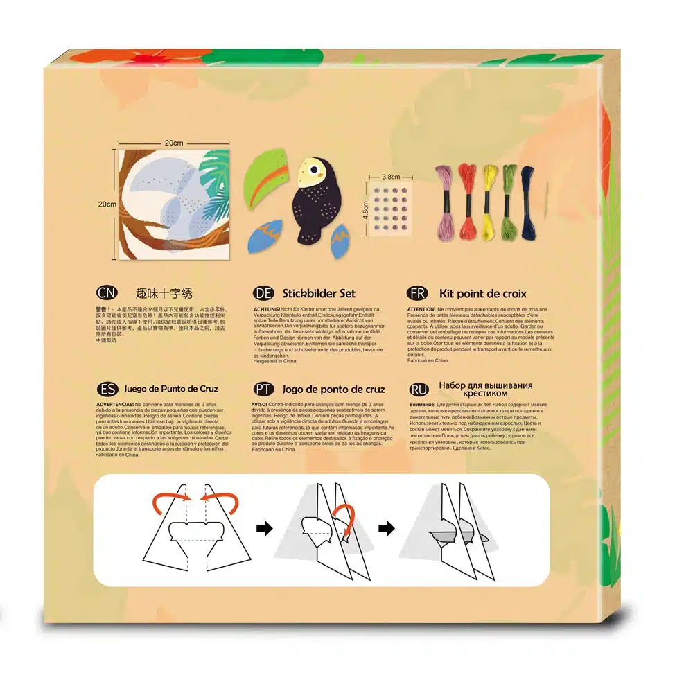 הערכה מכילה חוטים בשלל צבעים שעל ידי השחלה ומתיחתם מקצה לקצה תיווצר תמונה של תוכי צבעוני.