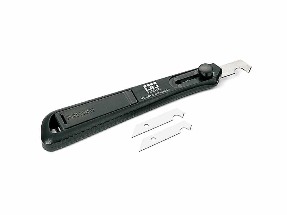 Plastic Scriber II של Tamiya מתאים במיוחד לחיתוך לוחות פלסטיק עבים, הוספת פרטים לדגמי קנה מידה וליצירת חורים במכוניות Mini 4WD. להב צר מפלדה תונגסטנית מאפשר גישה קלה למקומות שקשים להגיע אליהם. ניתן להחזיר את הלהב למצב נסתר כאשר אינו בשימוש.